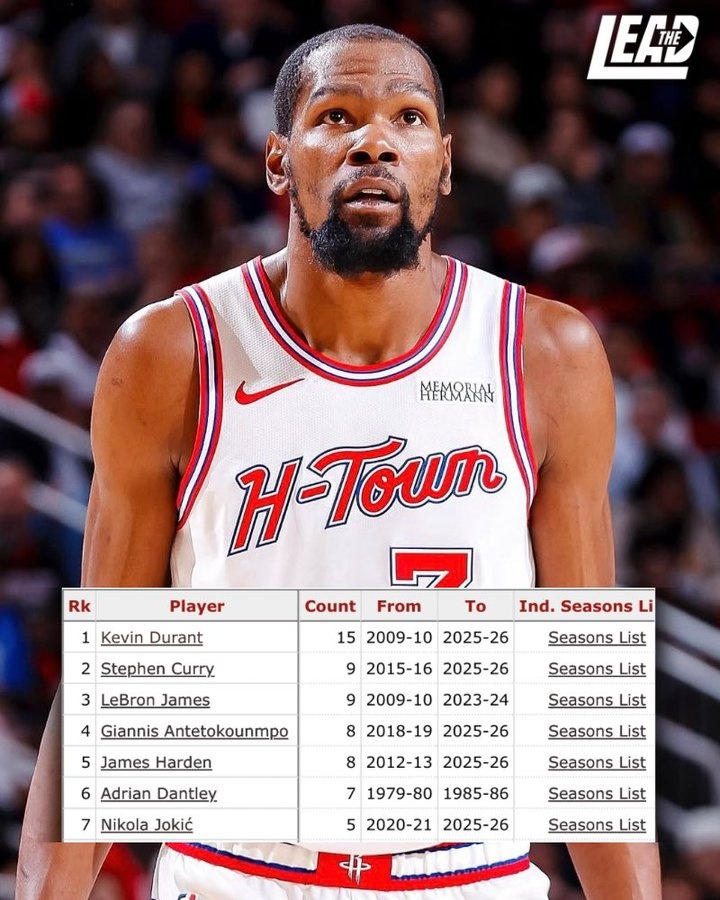 九游体育下载-赛季场均25+且真实命中率60+%次数:KD15次断档 库里&詹姆斯9次